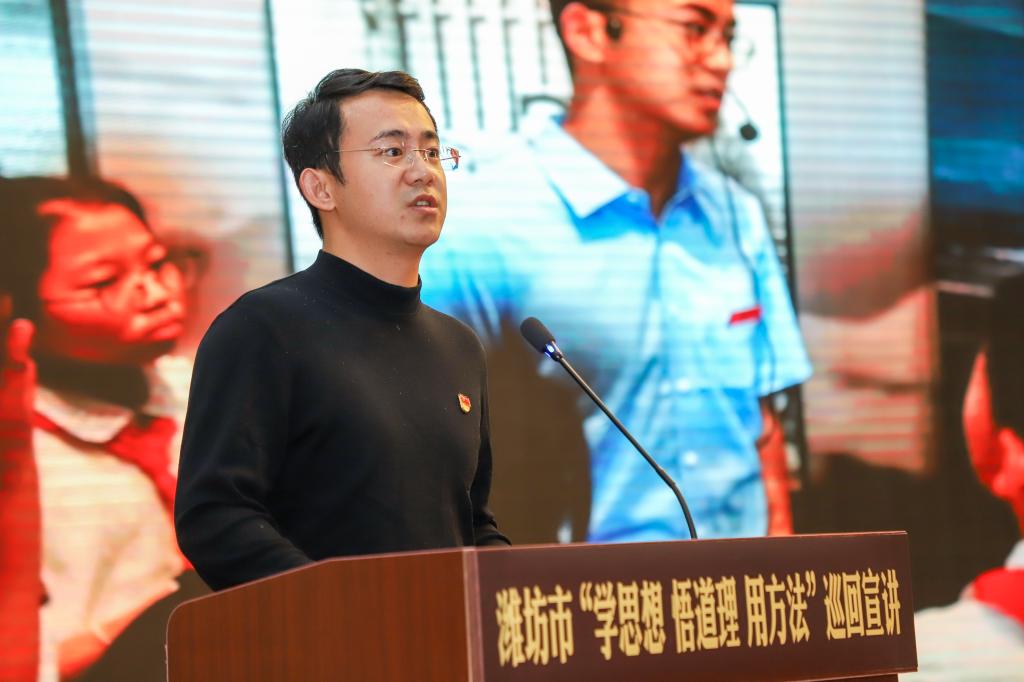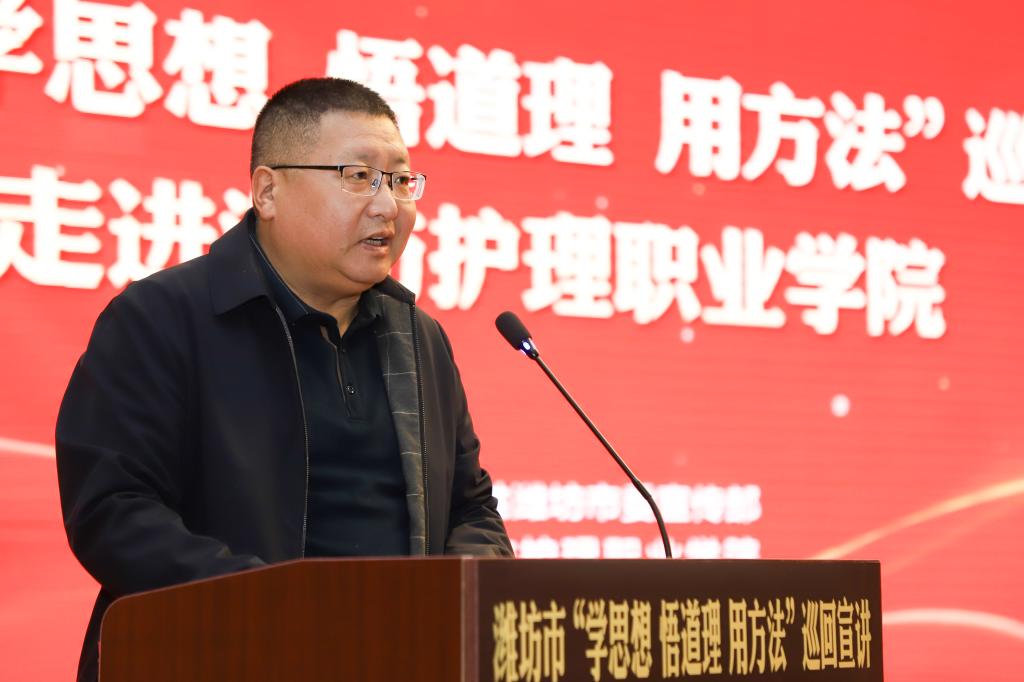 为深入学习贯彻习近平新时代中国特色社会主义思想,推动党的创新理论进校园、进课堂、进头脑,11月3日下午,潍坊市“学思想 悟道理 用方法”巡回宣讲活动走进潍坊护理职业学院,为师生带来一场有深度、有温度的理论宣讲和精神洗礼。潍坊市宣传文化服务中心副主任王海军,学院党委副书记苏建福,党委委员、宣传部部长郭兴华,青州市委宣传部副部长王庆周出席活动。