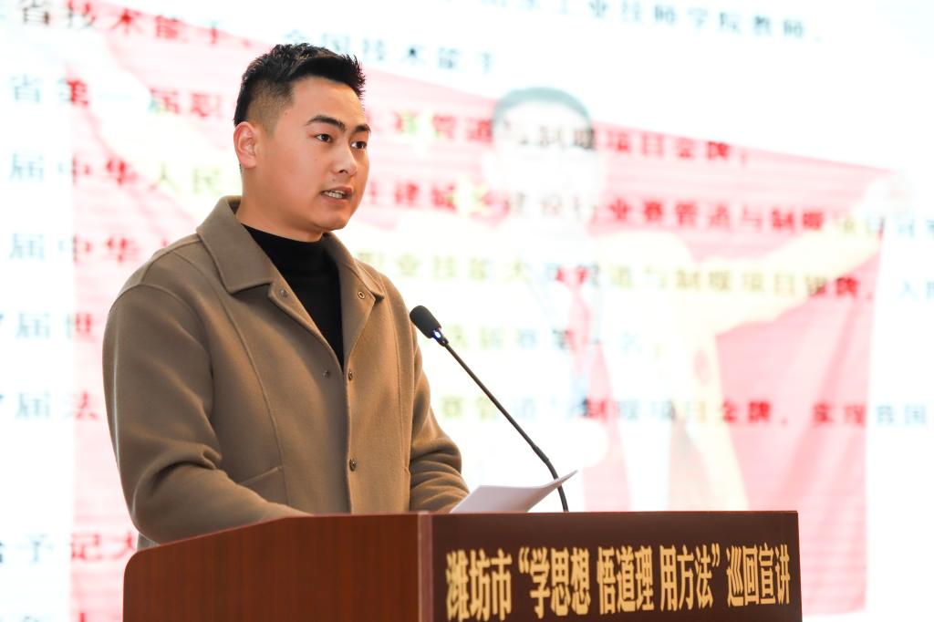 宣讲活动中,来自不同领域、不同岗位的宣讲员依次登台,以真实的故事、鲜活的语言、饱满的情感,讲述了新时代的奋斗篇章。潍坊市王尽美革命事迹教学基地服务中心杨洋以《尽美故里的“红色号手”》再现了革命先烈的热血足迹;潍坊农村干部教育实践中心张雪萍在《“百姓书记”的时代答卷》中动情讲述了王伯祥同志的为民情怀;世界技能大赛冠军孙伟龙分享了他从中考失意的“差生”到为国争光的“新时代青年工匠”的励志逆袭之路;宣讲员李心怡带来的《生命之桥》,深情讲述了张军桥医生在异国他乡用生命托举希望、践行大爱无疆的壮举;山东经贸职业学院学生们演绎的情景剧《红色家书》,以文艺形式让不朽的革命精神跨越时空,照亮人心。潍坊益都中心医院护士岳淑娟则从医护工作者的视角,讲述了一个与病魔抗争、因爱重生的感人故事,体现了“有时去治愈,常常去帮助,总是去安慰”的医学人文关怀;李奎辰带来的《从三次“划时代”改革看国家富强必由之路》,以宏观的历史视角深入剖析改革的发展脉络,激励青年将个人命运融入国家发展大局之中。